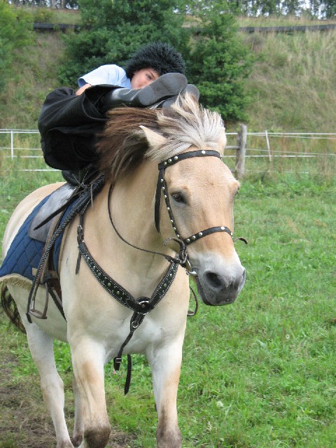 Hier zeigt Anton das Liegen, quer im Sattel.