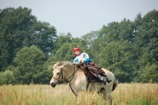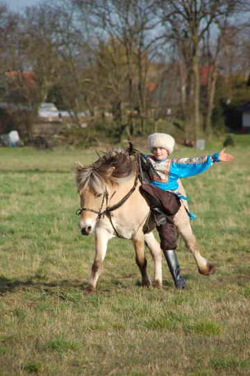 Und Boris bei einer Drehung auf dem Pferd. Diese Übung heißt "tadschikische Drehung".