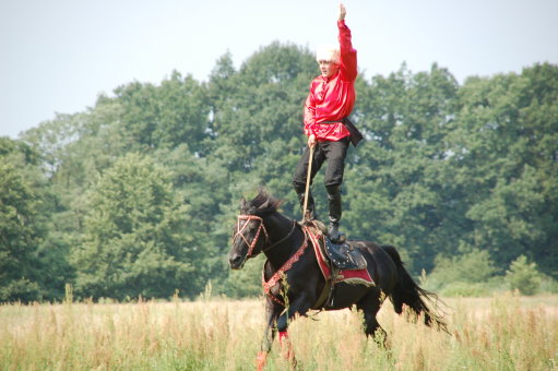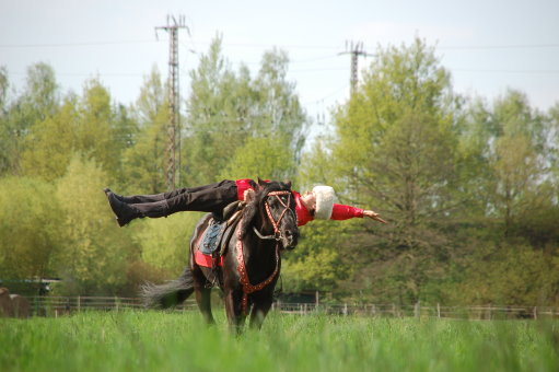 Im Unterschied zum Voltigieren galoppiert das Pferd beim Kosakenreiten sehr schnell. Die Übungen erfordern viel Kraft und sind teilweise nicht ungefährlich.