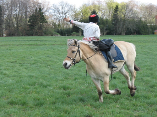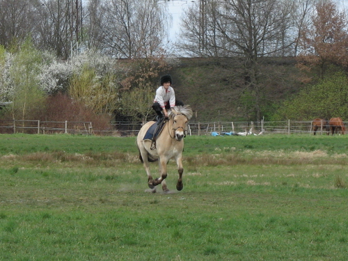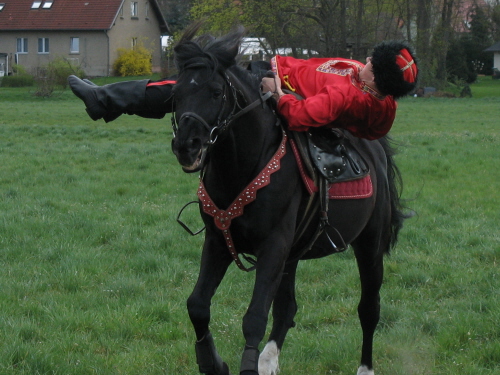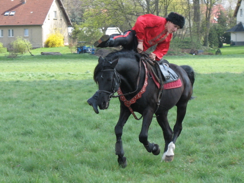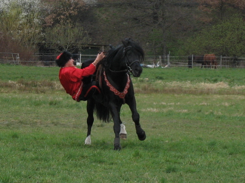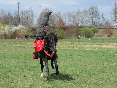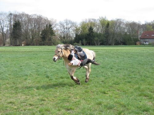 Boris im Galopp rückwärts auf dem Hals